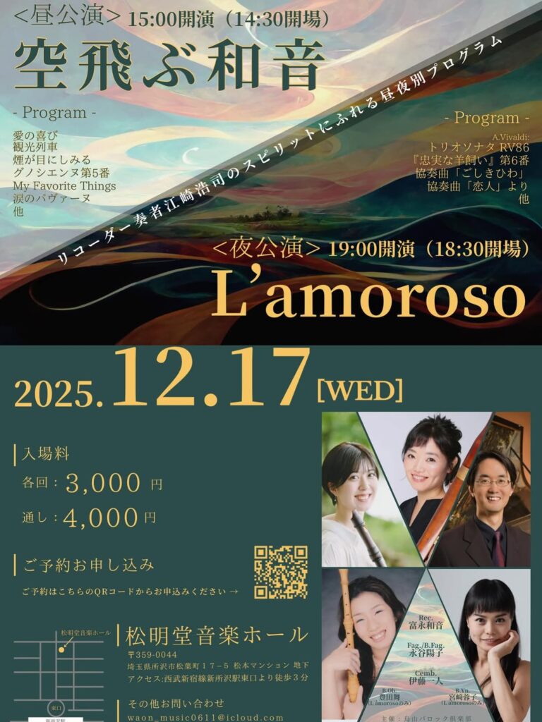 【12/17wed. 昼:空飛ぶ和音/夜:L’amoroso】 投稿の最終変更日:2025年11月16日 投稿カテゴリー:コンサート リコーダー奏者江崎浩司のスピリットにふれる昼夜別プログラム Please Share This Share this content Opens in a new window Opens in a new window Opens in a new window Opens in a new window Opens in a new window Opens in a new window Opens in a new window Opens in a new window Opens in a new window Opens in a new window おすすめ 【11/22sat. カンターレ・ユビラーテ チェンバロと紡ぐ古楽の喜び】 2025年11月16日 【12/21sun. スペインの名曲を楽しむクリスマスコンサート】 2025年11月13日 コメントを残す コメントをキャンセルコメントコメントする名前またはユーザー名を入力してください メールアドレスを入力してコメント Web サイトの URL を入力してください。(任意) 次回のコメントで使用するためブラウザーに自分の名前、メールアドレス、サイトを保存する。